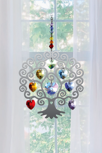 Alive with colour and meaning, this gold mirror finish Chakra Tree of Life motif is a radiant expression of balance and wellbeing. Each carefully selected rainbow heart crystal represents one of the seven chakras, creating a rainbow of light and harmony. This beautiful suncatcher features at its core, a 14mm Aurora Borealis Heart. Displayed together with other Radiance designs, it forms a captivating and cohesive collection that retailers have long loved to showcase.